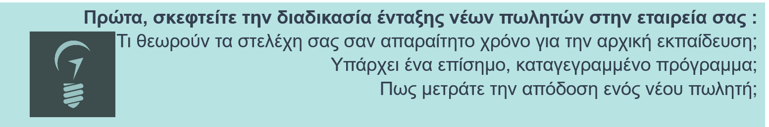 Οι περισσότερες εταιρείες όταν αναφέρονται σε νέες προσλήψεις στις Πωλήσεις σκέφτονται κυρίως την προϊοντική εκπαίδευση και ουσιαστικά δεν επενδύουν σε ολοκληρωμένα προγράμματα ένταξης. Έτσι ο χρόνος της Ανέλιξης (Ramp) που είναι ο χρόνος που χρειάζεται μια νέα πρόσληψη να φτάσει σε πλήρη παραγωγικότητα είναι μεγαλύτερη. Μπορεί να είναι 2 έως 5 φορές μεγαλύτερη σε σύγκριση με τις βέλτιστες πρακτικές και αυτό μπορεί να μεταφραστεί σε κόστος εκατομμυρίων Ευρώ. Απλά ποτέ δεν εμφανίζεται καθαρά και έτσι δεν υπολογίζεται. Μένει κρυφό.