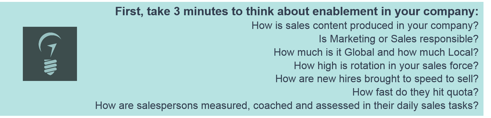Improving the productivity of sales organizations can happen in many ways, not necessarily through Sales Enablement: a software based method of introducing these processes, practices and tools. If is done through technology, it has to be done all the way, because it requires a major shift on the processes. Companies that have introduced halfheartedly, on top of their systems, have not reaped the benefits of their effort and investment.